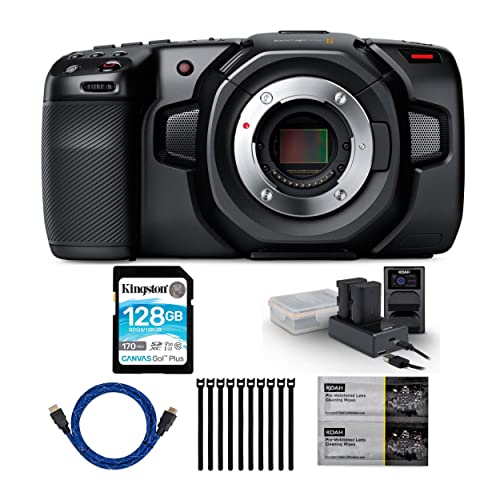 Bundle Includes: Blackmagic Design Pocket 4K Cinema Camera, 128GB SDXC Canvas Go Plus 170MB/s Read Memory Card (SDG3/128GB), Rechargeable 2250mAh Battery for Canon LP-E6NH (2-Pk) and LCD Dual Charger, Nylon-Braided 4K High-Speed HDMI Cable with Ethernet (6-Foot), Pre-Moistened Lens Cleaning Wipes (100-Pack), and Monoprice 6-Inch Hook and Loop Fastening Cable Ties (10-Pack, Black)