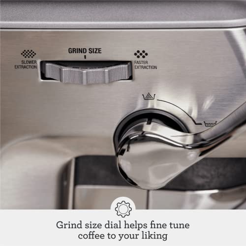 The integrated precision conical burr grinder features 25 ground settings, and the Impress Puck System provides intelligent dosing of freshly ground beans
