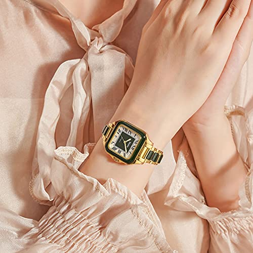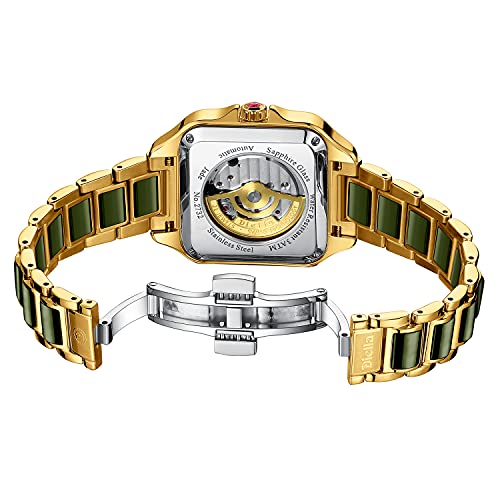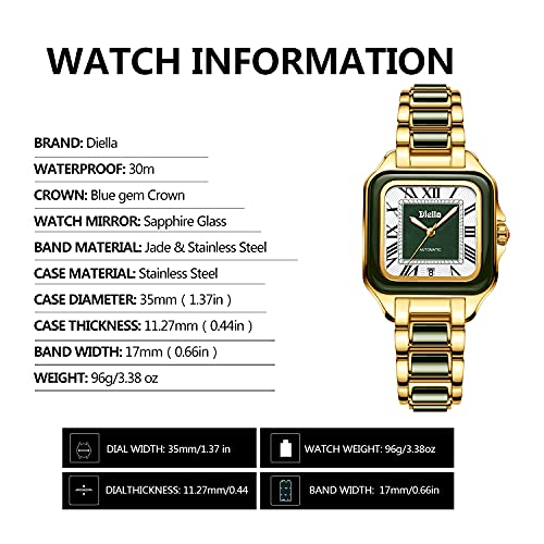 Diella Women Rectangle Dress Watch, Automatic Self Winding Jade & Stainless Steel Watches for Women, Roman Numerals Analog Watch with Date, Waterproof