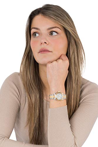 You can be a serious swimmer and still show a bit of style with the Invicta Women’s Pro Diver Mother-of-Pearl Dial Two-Tone Stainless Steel Watch. Its round stainless steel watch case is topped by a unidirectional rotating bezel in gold-tone with black outlined elapsed time engraving. The mother-of-pearl dial features large luminous Tritnite dial markers and hands (with seconds hand), with encroaching minute indexes. The two-tone stainless steel link bracelet band is joined by a fold over clasp with safety, and it mixes silver and polished gold-tone links. Other features include a date function at 3 o’clock, a durable mineral crystal, precise Swiss quartz movement, and water resistance to 100 meters (330 feet)–suitable for swimming.
