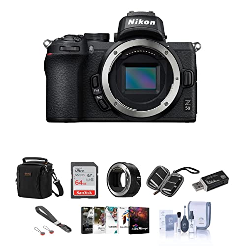 Nikon Z50 DX-Format Mirrorless Camera (Body Only) – Battery (EN-EL25) – Battery Charger (MH-32) – USB Cable – Strap – Body Cap – Rubber Eyecup – Nikon 1 Year Warranty – Nikon FTZ II Mount Adapter – Peak Design Wrist Strap – Shoulder Bag – 64GB SD Memory Card – Cleaning Kit – Memory Wallet – Card Reader – Software Package