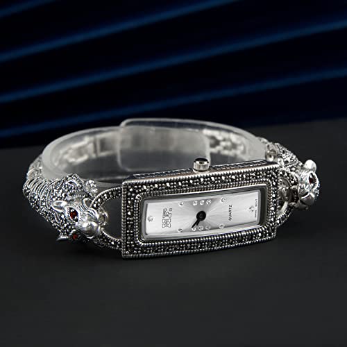 Women Wrist Watches Leopard Pave Marcasite Black 925 Silver Vintage Bracelet